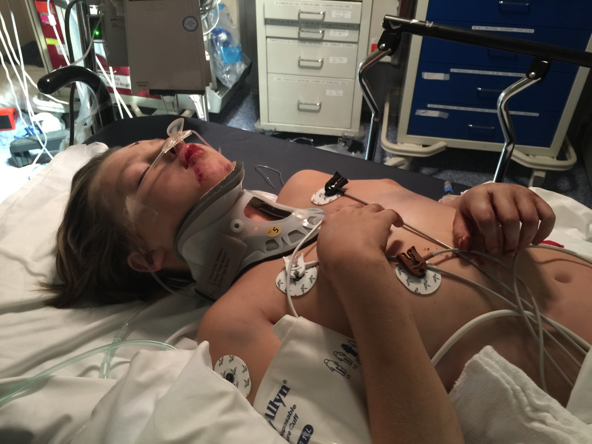 As soon as Alex was transported to the trauma unit, I ran to the Children’s Hospital. Literally. This route would be made over and over throughout the next few weeks. I was taken back to see Jacob and Joshua. They were both black and blue from head to toe. Joshua’s entire face was swollen and bleeding. Jacob had severe lacerations and broken bones everywhere. They were both heavily medicated but able to talk to us. This was the first time I was able to witness just how strong and brave our boys were. Jacob tried to make jokes with me. Joshua refused pain medication. To this day, I am overwhelmed with pride at strong our boys are.